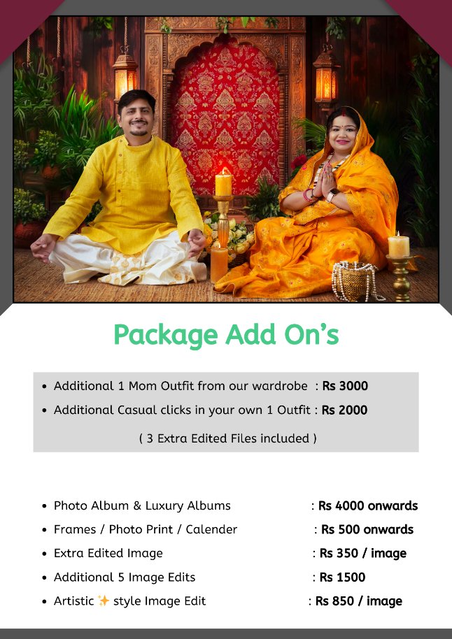 - Additional 1 Mom Outfit from our wardrobe ( 3 Extra Edited Files included ) : Rs 3000